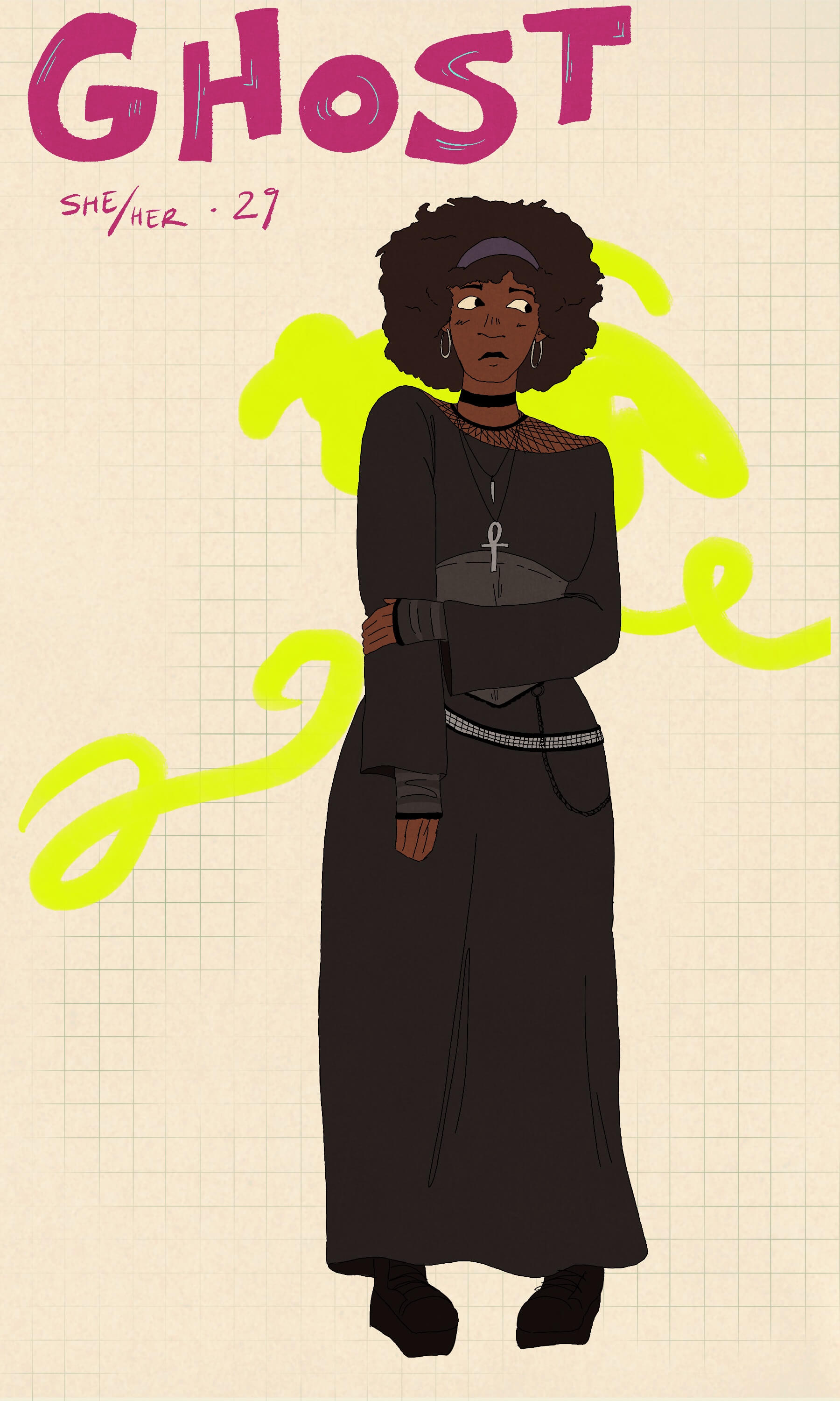 Despite her discomfort around other people, Ghost takes her participation in the goth subculture seriously, and never attempts to "dress down" in order to escape attention. This is largely twofold: on one hand, people tend to Expect a certain level of off-putting or alienating mannerisms from trad goths, so she can sometimes blend a little better with it, and on the other, it gives people who are willing to try speaking to her a topic to bring up that Ghost can almost always successfully talk about. She'll never be a social butterfly, but her fashion sense does occasionally give her the opportunity to be a metaphorical flower. That said, she does sometimes feel an alienation even in specific gothic circles dur to its tendency to be a little overwhelmingly white, but she'll take what she can get. She listens to a lot of traditional goth music (Siousxie and the Banshees, Bauhaus, Militia Vox, Mirel Wagner, etc.) and gets most of her clothes from thrift stores (overdyeing things black when necessary). For the most part, she keeps her hair loose and/or sculpted, rather than in protective styles, since she often lacks the energy needed for braids/locs and doesn't prefer to be touched in order to have them done professionally.